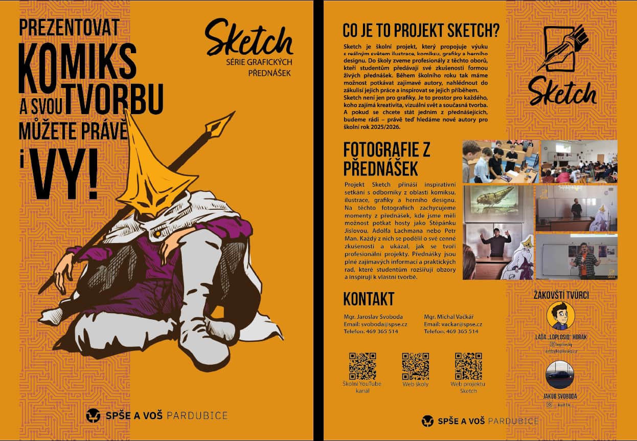 Projekt SKETCH se zaměřuje na grafické, výtvarné a herní přednášky, které přivádějí známé osobnosti z těchto oborů na SPŠE Pardubice. Vizuální identita projektu pomáhá udržet jednotný styl a přehlednou komunikaci napříč různými platformami.